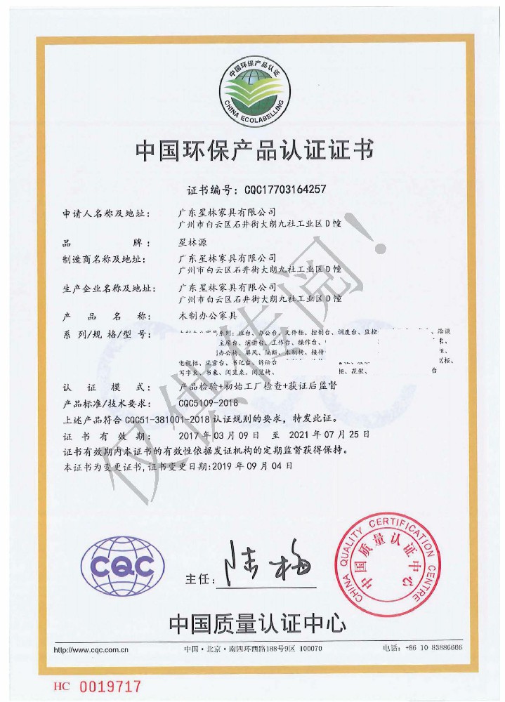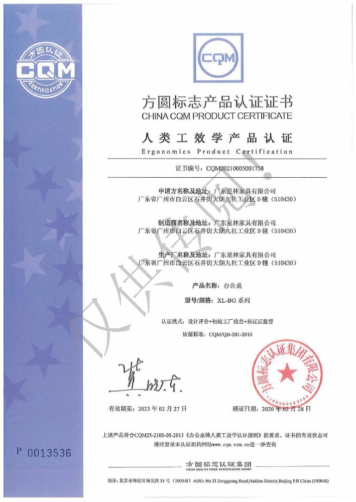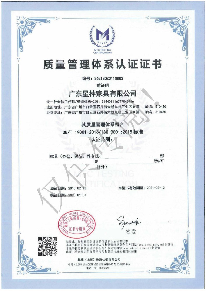 廣東星林家具有限公司創(chuàng)建于家具盛世之期,專業致力于辦公家具、醫療家具、養老家具的開發(fā)、設計、生產。公司率先通過ISO9001質量管理體系認證和ISO14001環(huán)境管理體系認證及職業健康安全管理體系認證,從而獲得了中環(huán)聯合(北京)認證中心有限公司頒發(fā)的“中國環(huán)境標志產品認證證書(十環(huán)認證)”等。